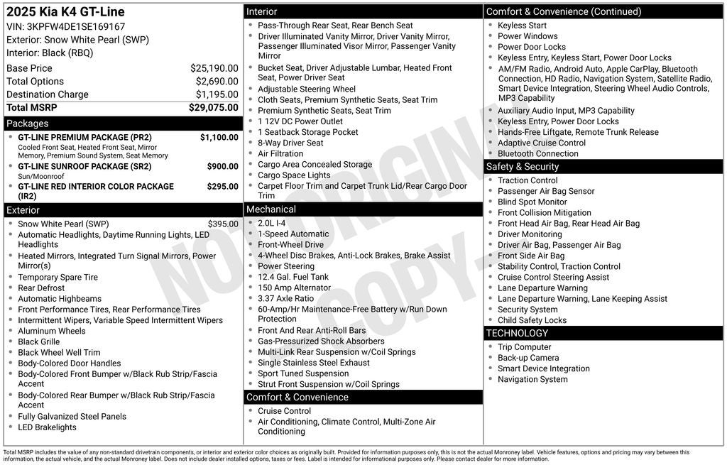Equipped with GT-Line Premium Package (Acoustic Windshield, Driver's Seat & Outer-Mirrors Memory, harman/kardon Premium Audio, SynTex Seat Trim, and Ventilated Front Seats), GT-Line Red Interior Color Package, GT-Line Sunroof Package (Wide Power Sunroof w/Power Sunshade), 4-Wheel Disc Brakes, 6 Speakers, ABS brakes, Air Conditioning, Alloy wheels, AM/FM radio: SiriusXM, Apple CarPlay & Android Auto, Auto High-beam Headlights, Automatic temperature control, Brake assist, Bumpers: body-color, Cloth/SynTex Seat Trim, Delay-off headlights, Driver door bin, Driver vanity mirror, Dual front impact airbags, Dual front side impact airbags, Electronic Stability Control, Four wheel independent suspension, Front anti-roll bar, Front Bucket Seats, Front Center Armrest, Front dual zone A/C, Front Heated Bucket Seats, Front reading lights, Fully automatic headlights, Heated door mirrors, Heated front seats, Illuminated entry, Low tire pressure warning, Navigation System, Occupant sensing airbag, Outside temperature display, Overhead airbag, Overhead console, Panic alarm, Passenger door bin, Passenger vanity mirror, Power door mirrors, Power driver seat, Power steering, Power windows, Radio data system, Radio: 12.3 Touchscreen Audio Display, Rear anti-roll bar, Rear seat center armrest, Rear side impact airbag, Rear window defroster, Remote keyless entry, Security system, Speed control, Split folding rear seat, Sport steering wheel, Steering wheel mounted audio controls, Tachometer, Telescoping steering wheel, Tilt steering wheel, Traction control, Trip computer, Turn signal indicator mirrors, Variably intermittent wipers, and Wheels: 18 x 8.0J Black Machined Alloy. Price includes: $500 - Military Program. Exp. 03/02/2026 MUST FINANCE THROUGH KFA