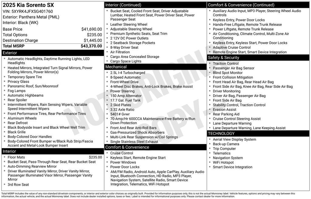 Panthera Metal 2025 Kia Sorento SX FWD 8 Speed Dual Clutch 2.5L I4 DGI Turbocharged DOHC 16V LEV3-SULEV30 281hp 2025 Kia Sorento SX in Panthera Metal with Artificial Leather.