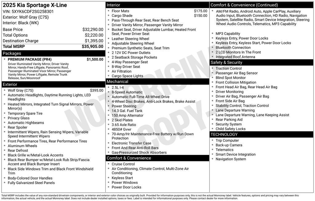 Equipped with Premium Package (Illuminated Dual Vanity Mirrors, LED Interior Lighting, Panoramic Sunroof, and Smart Power Liftgate), AWD, 4-Wheel Disc Brakes, 6 Speakers, ABS brakes, Air Conditioning, Alloy wheels, AM/FM radio: SiriusXM, Apple CarPlay & Android Auto, Auto High-beam Headlights, Automatic temperature control, Brake assist, Bumpers: body-color, Cargo Cover, Carpet Floor Mats X-Line, Compass, Delay-off headlights, Driver door bin, Driver vanity mirror, Dual front impact airbags, Dual front side impact airbags, Electronic Stability Control, Emergency communication system, Four wheel independent suspension, Front anti-roll bar, Front Bucket Seats, Front Center Armrest, Front dual zone A/C, Fully automatic headlights, Heated door mirrors, Heated Front Bucket Seats, Heated front seats, Illuminated entry, Leather steering wheel, Low tire pressure warning, Navigation System, Occupant sensing airbag, Outside temperature display, Overhead airbag, Overhead console, Panic alarm, Passenger door bin, Passenger vanity mirror, Power door mirrors, Power driver seat, Power steering, Power windows, Premium Leatherette Seat Trim, Radio: AM/FM/HD Audio System, Rain sensing wipers, Rear anti-roll bar, Rear seat center armrest, Rear side impact airbag, Rear window defroster, Rear window wiper, Remote keyless entry, Security system, Speed control, Speed-sensing steering, Split folding rear seat, Spoiler, Steering wheel mounted audio controls, Tachometer, Telescoping steering wheel, Tilt steering wheel, Traction control, Trip computer, Turn signal indicator mirrors, Variably intermittent wipers, and Wheels: 19 x 7.5J Gloss Black Alloy.