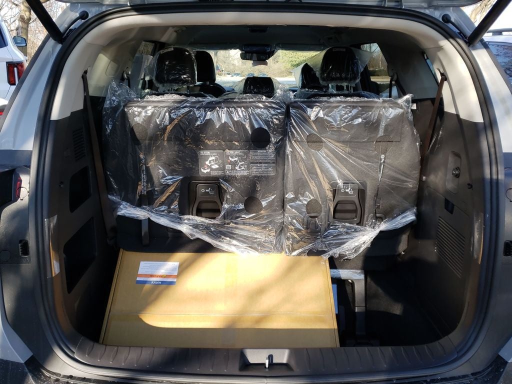 Equipped with 3.51 Axle Ratio, 3rd row seats: split-bench, 4-Wheel Disc Brakes, 8 Speakers, ABS brakes, Air Conditioning, All Weather Floor Mats (8-Passenger), Alloy wheels, AM/FM radio: SiriusXM, Apple CarPlay & Android Auto, Artificial Leather Seat Trim, Auto High-beam Headlights, Automatic temperature control, Brake assist, Bumpers: body-color, Compass, Delay-off headlights, Driver door bin, Driver vanity mirror, Dual front impact airbags, Dual front side impact airbags, Electronic Stability Control, Emergency communication system, Exterior Parking Camera Rear, Four wheel independent suspension, Front anti-roll bar, Front Bucket Seats, Front Center Armrest, Front dual zone A/C, Front reading lights, Fully automatic headlights, Heated door mirrors, Heated Front Bucket Seats, Heated front seats, Illuminated entry, Knee airbag, Leather Shift Knob, Leather steering wheel, Low tire pressure warning, Memory seat, Navigation System, Occupant sensing airbag, Outside temperature display, Overhead airbag, Overhead console, Panic alarm, Passenger door bin, Passenger vanity mirror, Power door mirrors, Power driver seat, Power Liftgate, Power passenger seat, Power steering, Power windows, Radio: AM/FM/HD Audio System, Rear air conditioning, Rear anti-roll bar, Rear reading lights, Rear window defroster, Rear window wiper, Reclining 3rd row seat, Remote keyless entry, Security system, Speed control, Speed-sensing steering, Split folding rear seat, Spoiler, Steering wheel mounted audio controls, Tachometer, Telescoping steering wheel, Tilt steering wheel, Traction control, Trip computer, Turn signal indicator mirrors, Variably intermittent wipers, and Wheels: 7.5J x 19 Machine-Finished Alloy.
