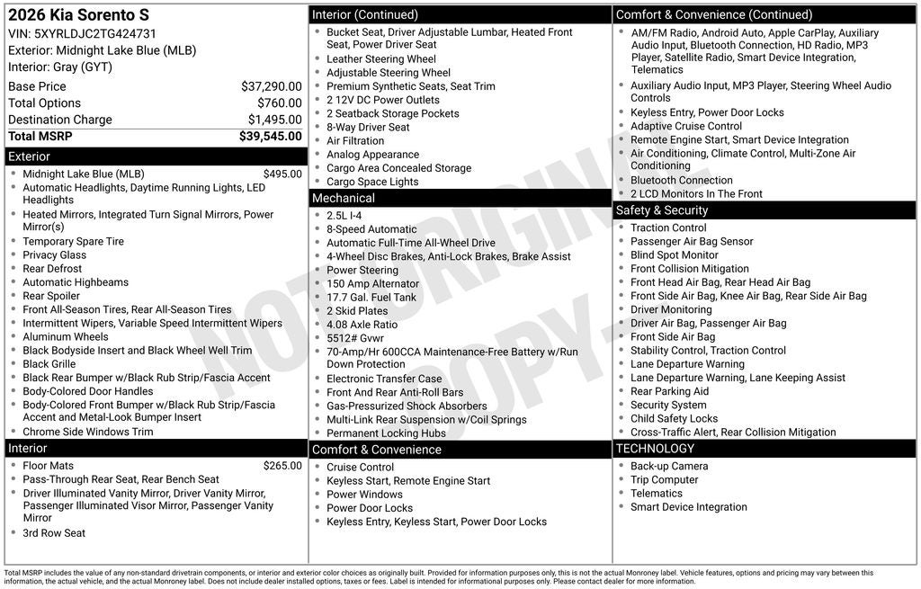 Priced below KBB Fair Purchase Price! Midnight Lake Blue 2026 Kia Sorento S AWD 8-Speed Automatic 2.5L I4 DGI DOHC 16V LEV3-SULEV30 191hp AWD.