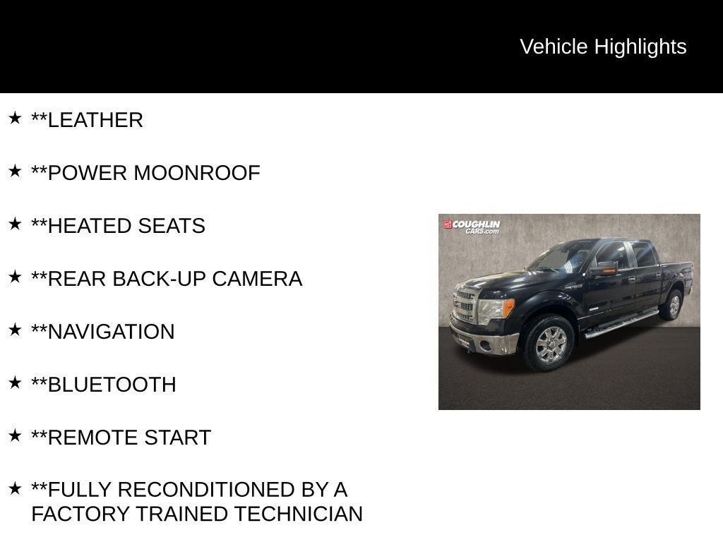 **LEATHER, **POWER MOONROOF, **HEATED SEATS, **REAR BACK-UP CAMERA, **NAVIGATION, **Bluetooth®, **REMOTE START, **FULLY RECONDITIONED BY A FACTORY TRAINED TECHNICIAN, 4WD, 4-Wheel Disc Brakes, ABS brakes, Air Conditioning, Alloy wheels, CD player, Compass, Delay-off headlights, Driver door bin, Driver vanity mirror, Dual front impact airbags, Dual front side impact airbags, Electronic Locking w/3.55 Axle Ratio, Electronic Stability Control, Front anti-roll bar, Front fog lights, Front reading lights, Front wheel independent suspension, Fully automatic headlights, GVWR: 7,200 lbs Payload Package, Illuminated entry, Low tire pressure warning, Occupant sensing airbag, Outside temperature display, Overhead airbag, Overhead console, Panic alarm, Passenger door bin, Passenger vanity mirror, Power door mirrors, Power steering, Power windows, Radio data system, Rear reading lights, Rear step bumper, Remote keyless entry, Security system, SiriusXM Satellite Radio, Speed control, Speed-sensing steering, Split folding rear seat, Steering wheel mounted audio controls, SYNC Voice Activated Communication & Entertainment, Tachometer, Tilt steering wheel, Traction control, Variably intermittent wipers, 4WD.