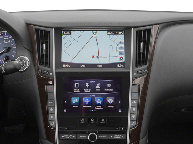 Equipped with Navigation Package (INFINITI InTouch Navigation System), Spare Tire Package (Jack Kit), 14 Speakers, 4-Wheel Disc Brakes, ABS brakes, Activation Disclaimer, Air Conditioning, Alloy wheels, AM/FM radio: SiriusXM, Anti-whiplash front head restraints, Auto-dimming Rear-View mirror, Automatic temperature control, BOSE Centerpoint Simulated Surround, Brake assist, Bumpers: body-color, CD player, Compass, Delay-off headlights, Driver door bin, Driver vanity mirror, Dual front impact airbags, Dual front side impact airbags, Electronic Stability Control, Floor Mats, Four wheel independent suspension, Front anti-roll bar, Front Bucket Seats, Front Center Armrest, Front dual zone A/C, Front fog lights, Front reading lights, Fully automatic headlights, Garage door transmitter: HomeLink, Heated door mirrors, Heated front seats, Heated Sport Front Seats, Heated steering wheel, Illuminated entry, INFINITI Studio on Wheels by Bose, Leather Shift Knob, Leather steering wheel, Leather-Appointed Seats, Literature Kit, Low tire pressure warning, Occupant sensing airbag, Outside temperature display, Overhead airbag, Overhead console, Panic alarm, Passenger door bin, Passenger vanity mirror, Power door mirrors, Power driver seat, Power moonroof, Power passenger seat, Power steering, Power windows, Radio data system, Radio: AM/FM/CD w/MP3 Playback Capability, Rear anti-roll bar, Rear reading lights, Rear seat center armrest, Rear window defroster, Remote keyless entry, Security system, Speed control, Speed-sensing steering, Speed-Sensitive Wipers, Sport steering wheel, Steering wheel mounted audio controls, Tachometer, Telescoping steering wheel, Tilt steering wheel, Traction control, Trip computer, Turn signal indicator mirrors, Variably intermittent wipers, and Wheels: 19 Aluminum-Alloy Sport.