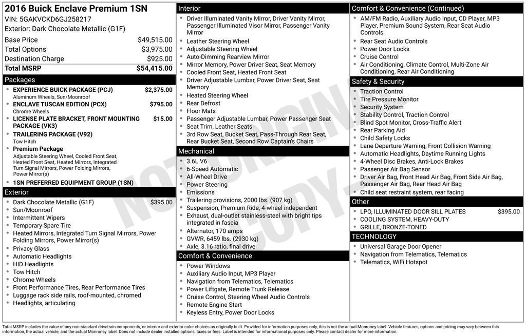 10 Speakers, 3.16 Axle Ratio, 3rd row seats: split-bench, 4-Wheel Disc Brakes, 4500lbs Trailering Package, 7-Passenger Seating, ABS brakes, Air Conditioning, Alloy wheels, AM/FM radio: SiriusXM, Articulating Headlights, Auto tilt-away steering wheel, Auto-dimming door mirrors, Auto-dimming Rear-View mirror, Automatic temperature control, Bose Performance-Enhanced 10-Speaker System, Bose Sound System, Brake assist, Bronze-Toned Grille, Bumpers: body-color, CD player, Compass, Delay-off headlights, Driver door bin, Driver vanity mirror, Dual front impact airbags, Dual front side impact airbags, Electronic Stability Control, Emergency communication system: OnStar Guidance, Enclave Tuscan Edition, Experience Buick Package, Exterior Parking Camera Rear, Forward Collision Alert & Lane Departure Warning, Four wheel independent suspension, Front anti-roll bar, Front Bucket Seats, Front Center Armrest w/Storage, Front dual zone A/C, Front License Plate Mounting Bracket, Front reading lights, Fully automatic headlights, Garage door transmitter, Heated & Cooled Driver & Front Passenger Seats, Heated door mirrors, Heated front seats, Heated steering wheel, Heavy-Duty Cooling System, High intensity discharge headlights: Bi-Xenon, Illuminated Door Sill Plates, Illuminated entry, Leather steering wheel, Low tire pressure warning, Memory seat, Navigation System, NavTraffic, Occupant sensing airbag, Outside temperature display, Overhead airbag, Panic alarm, Passenger door bin, Passenger vanity mirror, Perforated Leather-Appointed Seat Trim, Power door mirrors, Power driver seat, Power Liftgate, Power passenger seat, Power steering, Power Tilt & Telescopic Steering Column, Power Tilt-Sliding Moonroof, Power windows, Power-Folding Heated Body-Color Outside Mirrors, Preferred Equipment Group 1SN, Premium Package, Radio data system, Radio: Color Touch AM/FM/CD/Nav w/IntelliLink, Rear air conditioning, Rear anti-roll bar, Rear audio controls, Rear Audio System Controls, Rear Parking Sensors, Rear reading lights, Rear window defroster, Rear window wiper, Remote keyless entry, Roof rack: rails only, Security system, Speed control, Speed-sensing steering, Spoiler, Steering wheel memory, Steering wheel mounted audio controls, Tachometer, Telescoping steering wheel, Tilt steering wheel, Traction control, Trailer Hitch, Trip computer, Turn signal indicator mirrors, Variably intermittent wipers, Ventilated front seats, Voltmeter, Wheels: 19 Chrome-Clad Cast Aluminum, Wheels: 20 Bright-Machined Aluminum w/Blade Silver Pockets, Wheels: 20 Chrome-Clad Cast Aluminum w/Bronze Pockets. 2016 Buick Enclave CARFAX One-Owner. Priced below KBB Fair Purchase Price!