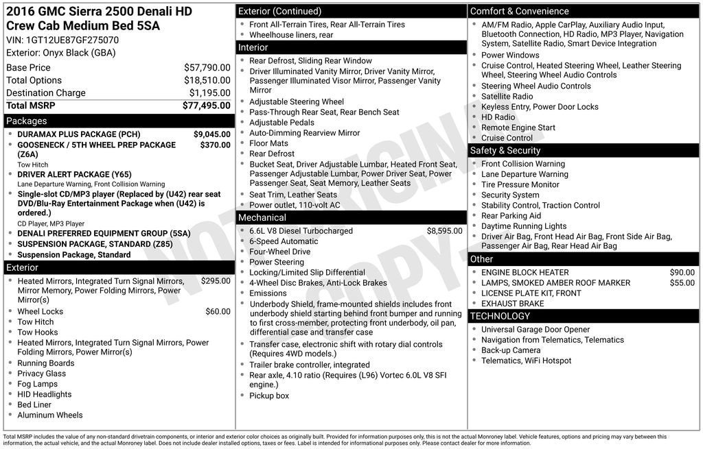110-Volt AC Power Outlet, 150 Amps Alternator, 4-Wheel Disc Brakes, 7 Speakers, 8 Multi-Color Driver Instrument Info Display, ABS brakes, Adjustable pedals, Air Conditioning, Alloy wheels, AM/FM radio: SiriusXM, Apple CarPlay, Auto-dimming door mirrors, Auto-Dimming Inside Rear-View Mirror, Auto-dimming Rear-View mirror, Automatic temperature control, Black Frame-Mounted Front Recovery Hooks, Bluetooth® For Phone, Body-Color Front Bumper, Bodyside moldings, Bose 7 Speaker Sound System, Brake assist, Bumpers: body-color, CD player, Chrome Bodyside Moldings, Chrome Door Handles, Chrome Power-Adjustable Heated Outside Mirrors, Chrome wheels, Color-Keyed Carpeted Floor Mats, Color-Keyed Carpeting Floor Covering, Compass, Deep-Tinted Glass, Delay-off headlights, Denali Decor, Driver & Front Passenger Vanity Mirror Visors, Driver Alert Package, Driver door bin, Driver vanity mirror, Dual front impact airbags, Dual front side impact airbags, Dual-Zone Automatic Climate Control, Duramax Plus Package, Electric Rear-Window Defogger, Electronic Shift Transfer Case, Electronic Stability Control, Emergency communication system, Engine Block Heater, Exhaust Brake, Exterior Parking Camera Rear, EZ-Lift & Lower Tailgate, Floor Mounted Console, Forward Collision Alert, Front anti-roll bar, Front Center Armrest, Front dual zone A/C, Front fog lights, Front Full Feature Bucket Seats, Front License Plate Kit, Front reading lights, Front wheel independent suspension, Fully automatic headlights, Garage door transmitter, Gooseneck/5th Wheel Prep Package, HD Radio, Heated & Vented Front Bucket Seats, Heated door mirrors, Heated Driver and Front Passenger Seats, Heated front seats, Heated Leather Wrapped Steering Wheel, Heated Power-Adjustable Outside Mirrors, Heated steering wheel, Heavy-Duty Handling/Trailering Suspension Package, High-Intensity Discharge Headlights, Illuminated entry, Lane Departure Warning System, Low tire pressure warning, Manual Tilt-Wheel/Telescoping Steering Column, Memory seat, Navigation System, Occupant sensing airbag, OnStar 4G LTE Wi-Fi Hotspot, OnStar 6 Months Guidance Plan, Outside temperature display, Overhead airbag, Overhead console, Panic alarm, Passenger door bin, Passenger vanity mirror, Perforated Leather Appointed Seat Trim, Power door mirrors, Power driver seat, Power passenger seat, Power Sliding Rear Window w/Defogger, Power steering, Power windows, Power Windows w/Driver Express Up & Down, Power-Adjustable Pedals For Accelerator & Brake, Premium audio system: IntelliLink, Radio: AM/FM/SiriusXM/HD w/Navigation, Rear 60/40 Folding Bench Seat (Folds Up), Rear Body-Color Bumper w/Bumper CornerSteps, Rear reading lights, Rear seat center armrest, Rear step bumper, Rear Vision Camera w/Dynamic Guide Lines, Rear Wheelhouse Liners, Rear window defroster, Remote Keyless Entry, Remote keyless entry, Remote Locking Tailgate, Remote Vehicle Starter System, Security system, Single Slot CD/MP3 Player, SiriusXM Satellite Radio, Smoked Amber Roof Marker Lamps, Speed control, Speed-sensing steering, Split folding rear seat, Steering Wheel Audio Controls, Steering wheel mounted audio controls, Tachometer, Telescoping steering wheel, Theft Deterrent System (Unauthorized Entry), Tilt steering wheel, Traction control, Trailer Brake Controller, Trailering Equipment, Trip computer, Turn signal indicator mirrors, Ultrasonic Front & Rear Park Assist, Universal Home Remote, Variably intermittent wipers, Ventilated front seats, Voltmeter, Wheel Locks (Set of 4) (LPO), Wheels: 20 Chrome Cast Aluminum, Wireless Charging. 2016 GMC Sierra 2500HD Clean CARFAX.