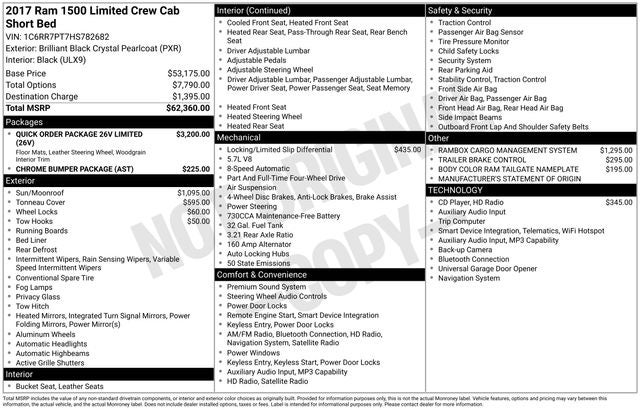 115V Auxiliary Power Outlet, 4-Corner Air Suspension, Black Closeout Trim, Body Color Fender Flares, Body Color Front Fascia, Body Color Rear Bumper w/Step Pads, Bright Front Bumper, Bright Rear Bumper, Bucket Seats, Center Hub, Chrome Belt Moldings, Chrome Bodyside Molding, Chrome Bumper Package, Chrome Grille w/RAM Letters, Chrome Ram Badge, Folding Flat Load Floor Storage, Heated Front Seats, Heated Second Row Seats, Heated Steering Wheel, High Back Seats, Laramie Limited Cluster, Laramie Limited Group, Laramie Limited Leather Bucket Seats, Leather Wrapped Grab Handle, Limited Tailgate Applique 4x4, Luxury Door Trim Panel, Luxury Front & Rear Floor Mats, Navigation System, Power 10-Way Memory Driver & 6-Way Passenger Seats, Quick Order Package 26V Limited, Ram 1500 Badge, Rear 60/40 Split Folding Seat, Rear Window Defroster, Steering Wheel Mounted Audio Controls, Ventilated Front Seats, Wheel to Wheel Side Steps, Wheels: 20 x 9 Painted Aluminum Chrome Insert, Wood/Leather Wrapped Steering Wheel.