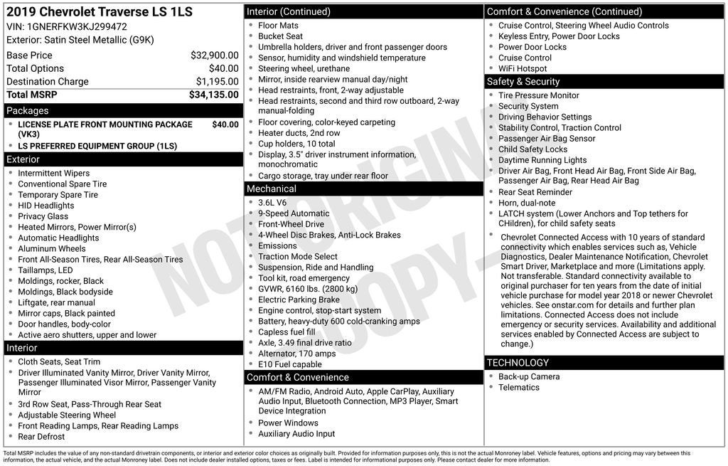 Satin Steel Metallic 2019 Chevrolet Traverse LS CARFAX One-Owner. Odometer is 46320 miles below market average! 18/27 City/Highway MPG