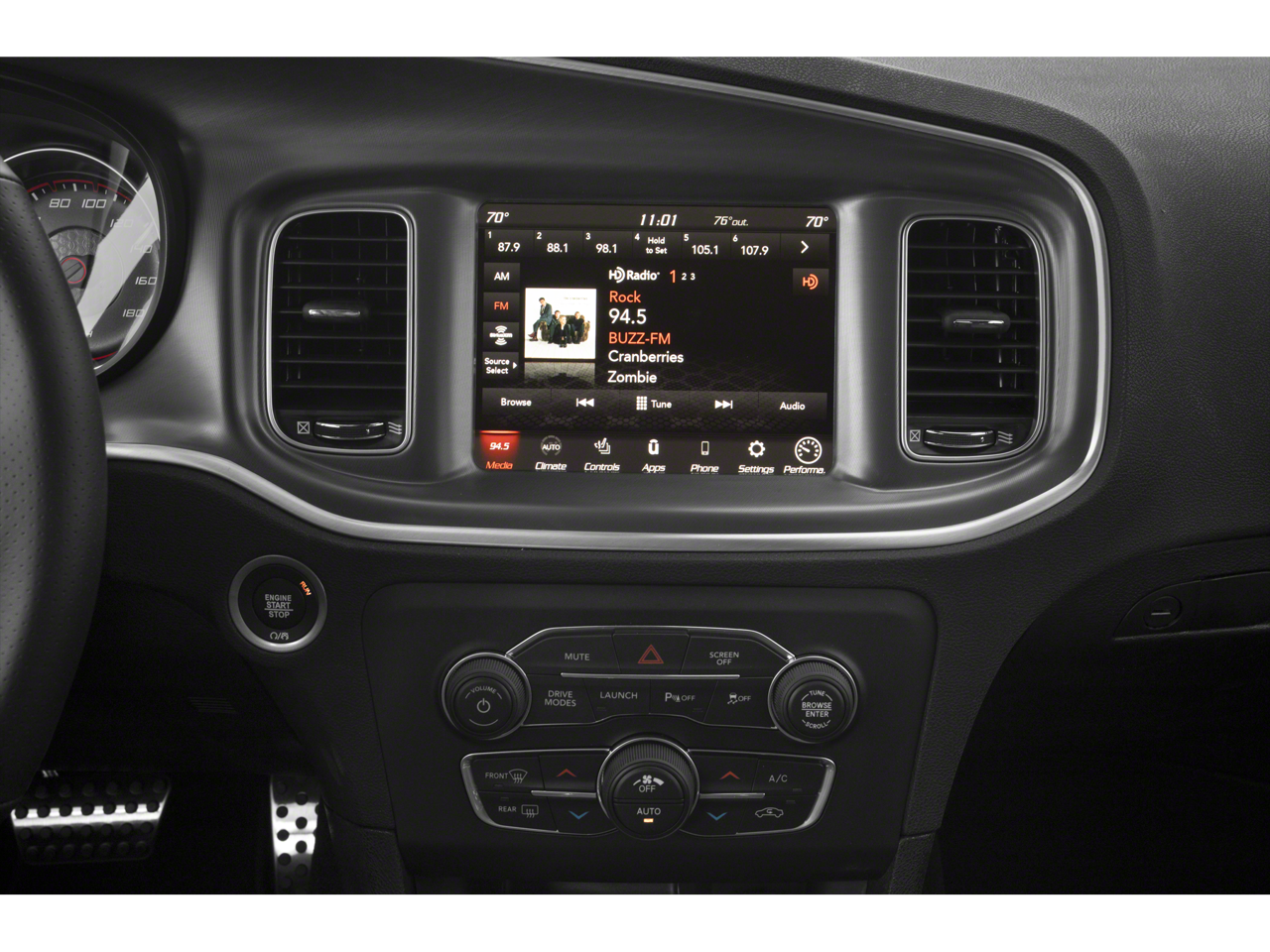 Inside, you'll find a wealth of premium features that elevate the driving experience. The Uconnect 4C navigation system with an 8.4-inch display keeps you connected and informed, while the heated and ventilated front seats, heated steering wheel, and premium-stitched dash provide exceptional comfort. The Daytona-themed interior accents, including the Carbonite trim and Nappa/Alcantara sport seats, add a touch of sophistication.