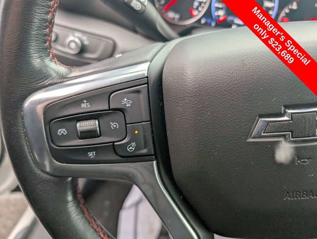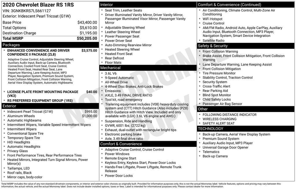 170 Amp Alternator, 3.49 Final Drive Axle Ratio, 4-Wheel Disc Brakes, 6 Speakers, 6-Speaker Audio System Feature, 6-Way Power Front Passenger Seat Adjuster, ABS brakes, Advanced Adaptive Cruise Control, Air Conditioning, Alloy wheels, AM/FM radio: SiriusXM, Apple CarPlay/Android Auto, Auto-dimming door mirrors, Auto-dimming Rear-View mirror, Automatic temperature control, Brake assist, Bumpers: body-color, Child-Seat-Sensing Airbag, Compass, Delay-off headlights, Driver door bin, Driver vanity mirror, Dual front impact airbags, Dual front side impact airbags, Electronic Stability Control, Emergency communication system: OnStar and Chevrolet connected services capable, Enhanced Automatic Emergency Braking, Enhanced Convenience & Driver Confidence II Pkg, Exterior Parking Camera Rear, Following Distance Indicator, Forward Collision Alert, Four wheel independent suspension, Front anti-roll bar, Front Bucket Seats, Front Center Armrest, Front dual zone A/C, Front Pedestrian Braking, Front reading lights, Fully automatic headlights, Garage door transmitter, HD Surround Vision, Heated door mirrors, Heated Driver & Front Passenger Seats, Heated front seats, Heated Rear Outboard Seating Positions, Heated steering wheel, Heavy-Duty Cooling System, High-Intensity Discharge Headlights, Hitch Guidance, Hitch Guidance w/Hitch View, Illuminated entry, IntelliBeam Headlamps, Knee airbag, Lane Keep Assist w/Lane Departure Warning, Leather Shift Knob, Low tire pressure warning, Memory Settings For Driver Seat & Exterior Mirrors, Navigation System, Occupant sensing airbag, Outside temperature display, Overhead airbag, Overhead console, Panic alarm, Passenger door bin, Passenger vanity mirror, Perforated Leather-Appointed Seat Trim, Power door mirrors, Power driver seat, Power Liftgate, Power passenger seat, Power steering, Power Tilt & Telescoping Steering Column, Power windows, Preferred Equipment Group 1RS, Radio data system, Radio: Chevrolet Infotainment 3 Plus System, Radio: Chevrolet Infotainment 3 Premium System, Rear anti-roll bar, Rear Camera Mirror, Rear reading lights, Rear seat center armrest, Rear window defroster, Rear window wiper, Remote keyless entry, Ride & Handling Suspension, Safety Alert Seat, Security system, SiriusXM w/360L, Speed control, Speed-sensing steering, Split folding rear seat, Spoiler, Steering wheel mounted audio controls, Tachometer, Telescoping steering wheel, Tilt steering wheel, Traction control, Trailering Equipment, Trip computer, Turn signal indicator mirrors, Variably intermittent wipers, Ventilated Driver & Front Passenger Seats, Voltmeter, Wheels: 20 Dark Android Machined-Face Aluminum, Wheels: 21 Gloss Black Aluminum, Wireless Charging. 2020 Chevrolet Blazer Priced below KBB Fair Purchase Price!
