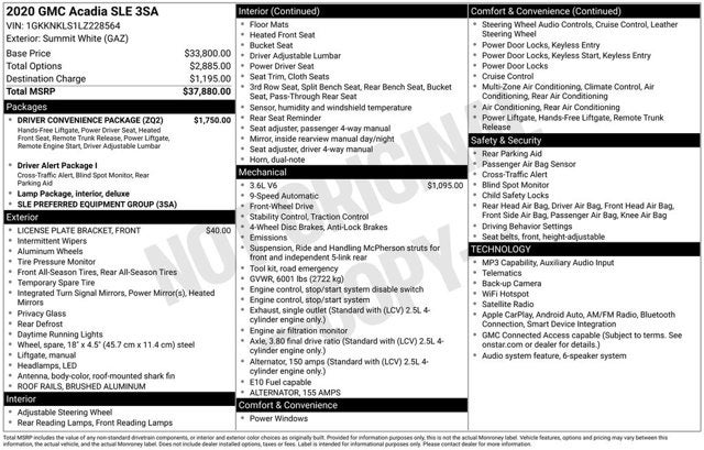 120-Volt Power Outlet, 155 Amp Alternator, 3rd row seats: split-bench, 4-Way Manual Driver Seat Adjuster, 4-Way Manual Passenger Seat Adjuster, 4-Wheel Disc Brakes, 6 Speakers, 6-Speaker Audio System Feature, 7-Passenger (2-3-2 Seating Configuration), 8-Way Power Driver Seat Adjuster, ABS brakes, Air Conditioning, Alloy wheels, AM/FM radio: SiriusXM, Apple CarPlay/Android Auto, Automatic temperature control, Brake assist, Brushed Aluminum Roof Rails, Bumpers: body-color, Compass, Delay-off headlights, Driver Convenience Package, Driver door bin, Driver vanity mirror, Dual front impact airbags, Dual front side impact airbags, Electronic Stability Control, Emergency communication system: OnStar and GMC connected services capable, Four wheel independent suspension, Front anti-roll bar, Front Bucket Seats, Front Center Armrest, Front dual zone A/C, Front License Plate Bracket, Front reading lights, Fully automatic headlights, Hands Free Power Programmable Liftgate, Heated door mirrors, Heated Driver & Front Passenger Seats, Illuminated entry, Knee airbag, Low tire pressure warning, Occupant sensing airbag, Outside temperature display, Overhead airbag, Overhead console, Panic alarm, Passenger door bin, Passenger vanity mirror, Power door mirrors, Power Driver Lumbar Control Seat Adjuster, Power steering, Power windows, Preferred Equipment Group 3SA, Premium audio system: GMC Infotainment System, Premium Cloth Seat Trim, Radio data system, Radio: AM/FM w/8 Diagonal Multi-Touch Display, Rear air conditioning, Rear anti-roll bar, Rear reading lights, Rear seat center armrest, Rear window defroster, Rear window wiper, Remote keyless entry, Remote Start, Security system, SiriusXM Radio, Speed control, Speed-sensing steering, Split folding rear seat, Spoiler, Steering wheel mounted audio controls, Tachometer, Telescoping steering wheel, Tilt steering wheel, Traction control, Trip computer, Turn signal indicator mirrors, Variably intermittent wipers, Voltmeter, Wheels: 18 Machined Aluminum w/Dark Accents. 2020 GMC Acadia Clean CARFAX.