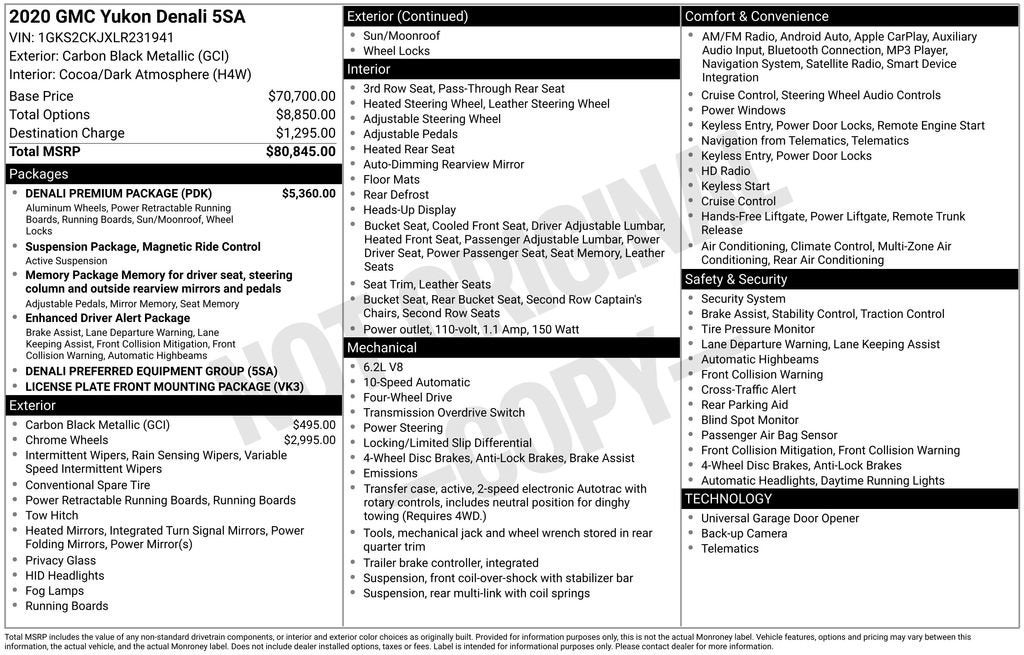 ***CALL 740-773-2153 FOR MOST ACCURATE INFORMATION***Discover the pinnacle of luxury and capability in the 2020 GMC Yukon Denali. This stunning SUV boasts an impressive array of premium features that elevate your driving experience to new heights.- Denali Premium Package- 22 Bright Aluminum Wheels with Midnight Silver Premium Paint- Carbon Black Metallic ExteriorStep inside and be enveloped in the refined comfort of the Yukon Denali. Enjoy the convenience of the Hands Free Power Programmable Rear Liftgate, the clarity of the Bose Centerpoint Surround Sound Audio System, and the seamless connectivity of Apple CarPlay and Android Auto. The Heated and Ventilated Driver and Front Passenger Seats provide unparalleled comfort, while the Power Tilt and Telescopic Steering Column allows you to find your perfect driving position.This Yukon Denali is equipped with the powerful EcoTec3 6.2L V8 engine mated to a smooth-shifting 10-Speed Automatic Transmission with Overdrive. Tackle any terrain with confidence thanks to the Magnetic Ride Control Suspension and 4-Wheel Drive. Impressive fuel efficiency ratings of 14 city/22 highway MPG make this Yukon Denali a practical choice for your everyday adventures.Safety is a top priority, and the Yukon Denali delivers with features like Forward Collision Alert, Lane Keep Assist with Lane Departure Warning, and Rear Cross Traffic Alert. The Heads-Up Display and Surround Vision Camera System provide added peace of mind and convenience.Experience the pinnacle of luxury, capability, and technology in the 2020 GMC Yukon Denali. This exceptional SUV is ready to elevate your driving experience. Don't miss your chance to make this Yukon Denali yours.Why Buy From Coughlin?At Coughlin Automotive, we keep over 1,000 pre-owned vehicles in stock across 18 dealerships. Enjoy small-town service with big-store selection. Every vehicle is inspected, competitively priced, and backed by our commitment to honesty, value, and customer satisfaction.We carry all makes and models and have vehicles in all different colors. Our pre-owned vehicles could have some of the following features listed: Alloy wheels, aluminum wheels, backup camera, Bluetooth®, cargo package, chrome wheels, convenience package, leather seats, navigation system, power package, remote start, SE package, safety package, sunroof/moonroof, tow package, adaptive cruise control, comfort package, trailer package, appearance package, acoustical package, DVD entertainment system, preferred package, technology package, driver confidence package, audio package, heat package, memory package, off-road package, premium package, premium sound package, remote vehicle starter prep package.