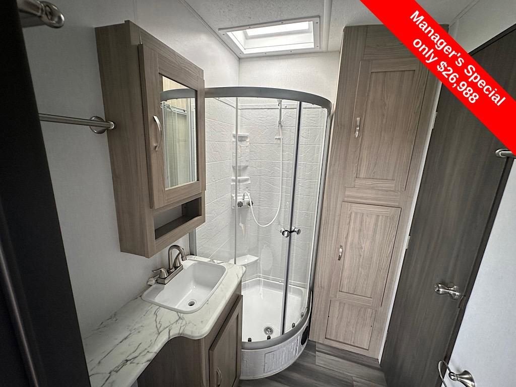 Bathroom with shower, skylight, and vanity