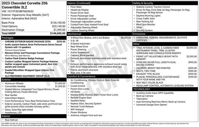 Hypersonic Gray Metallic 2023 Chevrolet Corvette Z06 3LZ NEW LOWER PRICE, DETAILED, CLEAN CARFAX, **ONE OWNER**, 3LZ, FRONT LIFT, GREAT VALUE, CERAMIC BRAKES. CARFAX One-Owner.