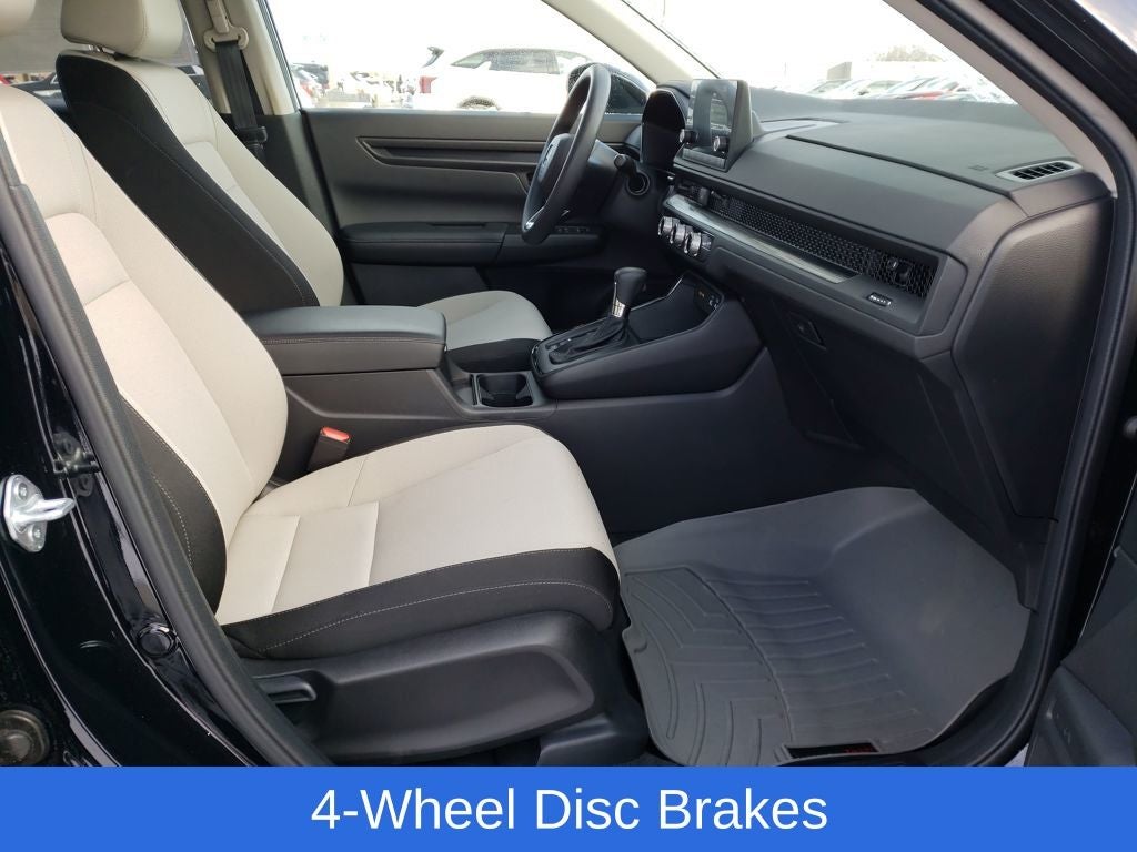 Crystal Black Pearl 2023 Honda CR-V EX AWD CVT 1.5L I4 DOHC 16V AWD, 4-Wheel Disc Brakes, 5.64 Axle Ratio, 6 Speakers, ABS brakes, Adaptive Cruise Control: Adaptive Cruise Control (ACC) with Low-Speed Follow, Air Conditioning, Alloy wheels, Apple CarPlay/Android Auto, Auto High-beam Headlights, Automatic temperature control, Brake assist, Bumpers: body-color, Cloth Seat Trim, Compass, Delay-off headlights, Driver door bin, Driver vanity mirror, Dual front impact airbags, Dual front side impact airbags, Electronic Stability Control, Exterior Parking Camera Rear, Four wheel independent suspension, Front anti-roll bar, Front Bucket Seats, Front Center Armrest, Front dual zone A/C, Front reading lights, Fully automatic headlights, Heated door mirrors, Heated Front Bucket Seats, Heated front seats, Illuminated entry, Knee airbag, Low tire pressure warning, Occupant sensing airbag, Outside temperature display, Overhead airbag, Overhead console, Panic alarm, Passenger door bin, Passenger vanity mirror, Power door mirrors, Power driver seat, Power moonroof, Power steering, Power windows, Radio data system, Radio: 240-Watt AM/FM Audio System, Rear anti-roll bar, Rear reading lights, Rear seat center armrest, Rear side impact airbag, Rear window defroster, Rear window wiper, Remote keyless entry, Security system, Speed control, Speed-sensing steering, Speed-Sensitive Wipers, Split folding rear seat, Spoiler, Steering wheel mounted audio controls, Tachometer, Telescoping steering wheel, Tilt steering wheel, Traction control, Trip computer, Turn signal indicator mirrors, Variably intermittent wipers, Wheels: 18 Sparkle Silver Metallic.
