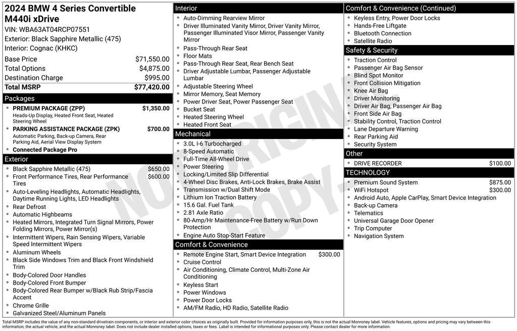 Black Sapphire Metallic 2024 BMW 4 Series M440i xDrive 22/31 City/Highway MPG