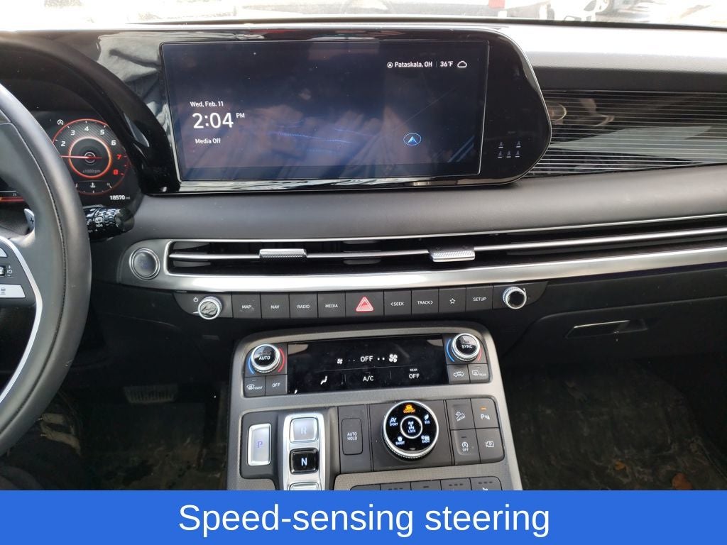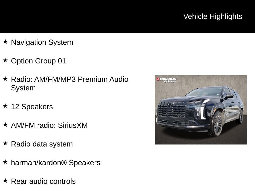 Abyss Black Pearl 2024 Hyundai Palisade Calligraphy Night Edition AWD 8-Speed Automatic with SHIFTRONIC V6 Palisade Calligraphy Night Edition, 4D Sport Utility, V6, 8-Speed Automatic with SHIFTRONIC, AWD, Abyss Black Pearl, Black Leather, 12 Speakers, 3.648 Axle Ratio, 3rd row seats: split-bench, 4-Wheel Disc Brakes, ABS brakes, Air Conditioning, Alloy wheels, AM/FM radio: SiriusXM, Apple CarPlay & Android Auto, Auto High-beam Headlights, Auto-dimming door mirrors, Auto-dimming Rear-View mirror, Auto-leveling suspension, Automatic temperature control, Brake assist, Bumper Applique, Bumpers: body-color, Cargo Block, Cargo Tray, Carpeted Floor Mats, Compass, Delay-off headlights, Driver door bin, Driver vanity mirror, Dual front impact airbags, Dual front side impact airbags, Electronic Stability Control, Emergency communication system, Exterior Parking Camera Rear, First Aid Kit, Four wheel independent suspension, Front anti-roll bar, Front Bucket Seats, Front Center Armrest, Front dual zone A/C, Front reading lights, Fully automatic headlights, Garage door transmitter: HomeLink, harman/kardon® Speakers, Heads-Up Display, Heated & Ventilated Front Bucket Seats, Heated door mirrors, Heated rear seats, Heated steering wheel, Illuminated entry, Knee airbag, Low tire pressure warning, Memory seat, Microfiber Suede Seat Trim, Mudguards, Navigation System, Occupant sensing airbag, Option Group 01, Outside temperature display, Overhead airbag, Overhead console, Panic alarm, Passenger door bin, Passenger vanity mirror, Power door mirrors, Power driver seat, Power Liftgate, Power moonroof, Power passenger seat, Power steering, Power windows, Radio data system, Radio: AM/FM/MP3 Premium Audio System, Rain sensing wipers, Rear air conditioning, Rear anti-roll bar, Rear audio controls, Rear reading lights, Rear side impact airbag, Rear window defroster, Rear window wiper, Reclining 3rd row seat, Remote keyless entry, Roadside Assistance Kit, Roof rack, Security system, Speed control, Speed-sensing steering, Split folding rear seat, Spoiler, Steering wheel mounted audio controls, Tachometer, Telescoping steering wheel, Tilt steering wheel, Traction control, Trip computer, Turn signal indicator mirrors, Variably intermittent wipers, Ventilated rear seats, Wheels: 20 x 7.5J Black Liquid Paint Alloy.