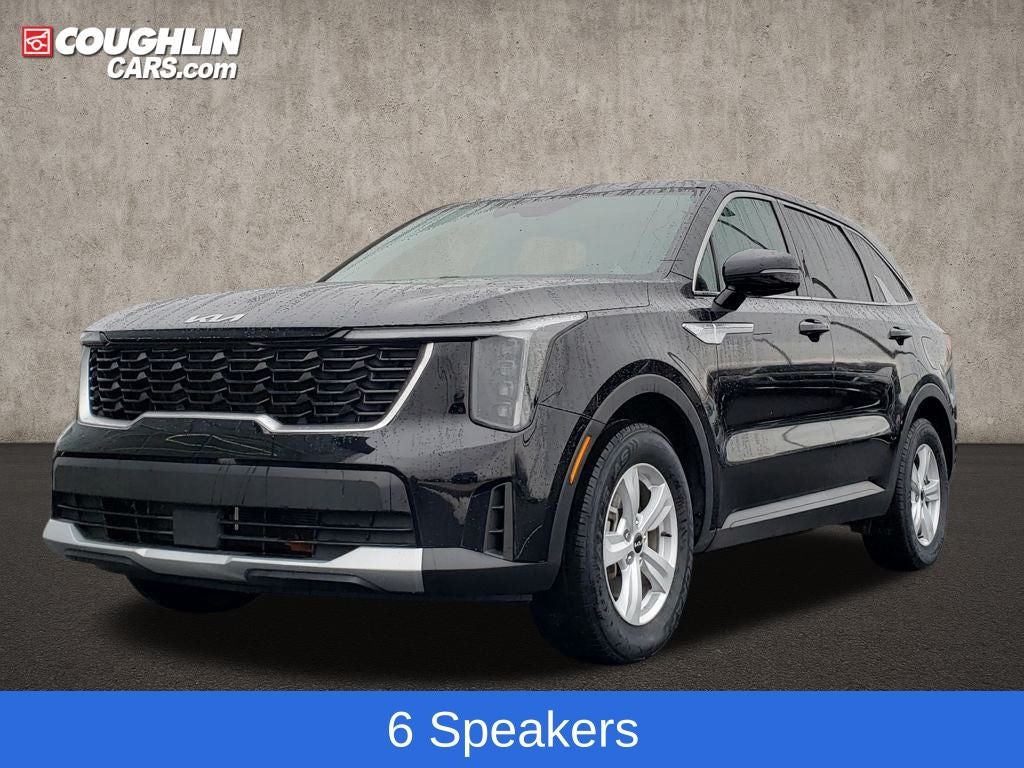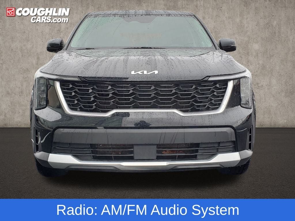 Ebony Black 2024 Kia Sorento LX FWD 8-Speed Automatic 2.5L I4 DGI DOHC 16V LEV3-SULEV30 191hp 3.798 Axle Ratio, 3rd row seats: split-bench, 4-Wheel Disc Brakes, 6 Speakers, 7.0J x 17 Alloy Wheels, ABS brakes, Air Conditioning, Alloy wheels, AM/FM radio: SiriusXM, Apple CarPlay & Android Auto, Auto High-beam Headlights, Brake assist, Bumpers: body-color, Carpeted Floor Mats, Cloth Seat Trim, Delay-off headlights, Driver door bin, Driver vanity mirror, Dual front impact airbags, Dual front side impact airbags, Electronic Stability Control, Emergency communication system: 911 Connect, Exterior Parking Camera Rear, Four wheel independent suspension, Front anti-roll bar, Front Bucket Seats, Front Center Armrest, Front reading lights, Fully automatic headlights, Heated door mirrors, Illuminated entry, Knee airbag, Low tire pressure warning, Occupant sensing airbag, Outside temperature display, Overhead airbag, Overhead console, Panic alarm, Passenger door bin, Passenger vanity mirror, Power door mirrors, Power steering, Power windows, Radio data system, Radio: AM/FM Audio System, Rear anti-roll bar, Rear reading lights, Rear seat center armrest, Rear side impact airbag, Rear window defroster, Rear window wiper, Remote keyless entry, Security system, Smart Key w/ Push Button and Remote Start, Speed control, Speed-sensing steering, Split folding rear seat, Spoiler, Steering wheel mounted audio controls, Tachometer, Telescoping steering wheel, Tilt steering wheel, Traction control, Trip computer, Turn signal indicator mirrors, Variably intermittent wipers.