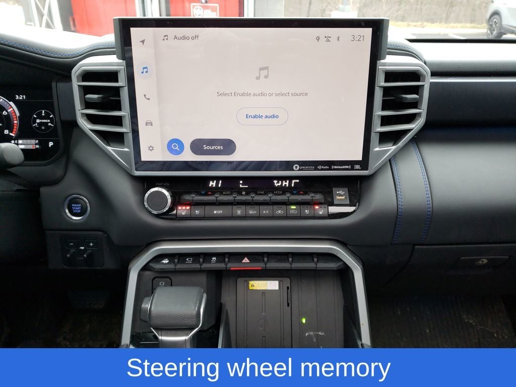 Lunar Rock 2024 Toyota Tundra Platinum 4WD 10-Speed Automatic 3.4L V6 LOCAL TRADE, CLEAN CARFAX, 4D CrewMax, 3.4L V6, 4WD, 10-Way Pwr Adj Heated and Ventilated Front Seats, 12 Speakers, 3.31 Axle Ratio, 4-Wheel Disc Brakes, ABS brakes, Air Conditioning, Alloy wheels, AM/FM radio: SiriusXM, Apple CarPlay/Android Auto, Auto High-beam Headlights, Auto-dimming door mirrors, Auto-dimming Rear-View mirror, Automatic temperature control, Brake assist, Bumpers: body-color, Delay-off headlights, Driver door bin, Driver vanity mirror, Dual front impact airbags, Dual front side impact airbags, Electronic Stability Control, Emergency communication system: Safety Connect (10-year trial), Exterior Parking Camera Rear, Front anti-roll bar, Front Bucket Seats, Front Center Armrest, Front dual zone A/C, Front fog lights, Front reading lights, Front wheel independent suspension, Fully automatic headlights, Garage door transmitter: HomeLink, Heated door mirrors, Heated front seats, Heated rear seats, Heated steering wheel, Illuminated entry, Knee airbag, Leather Seat Trim, Leather Shift Knob, Low tire pressure warning, Memory seat, Navigation System, Occupant sensing airbag, Outside temperature display, Overhead airbag, Overhead console, Panic alarm, Passenger door bin, Passenger vanity mirror, Power door mirrors, Power driver seat, Power moonroof, Power passenger seat, Power steering, Power windows, Radio data system, Radio: Audio Multimedia System, Rain sensing wipers, Rear reading lights, Rear seat center armrest, Rear step bumper, Rear window defroster, Remote keyless entry, Safety Connect, Security system, Speed control, Speed-sensing steering, Split folding rear seat, Steering wheel memory, Steering wheel mounted audio controls, Tachometer, Telescoping steering wheel, Tilt steering wheel, Traction control, Trip computer, Turn signal indicator mirrors, Variably intermittent wipers, Ventilated front seats, Ventilated rear seats, Voltmeter, Wheels: 20 Dark Painted Alloy.