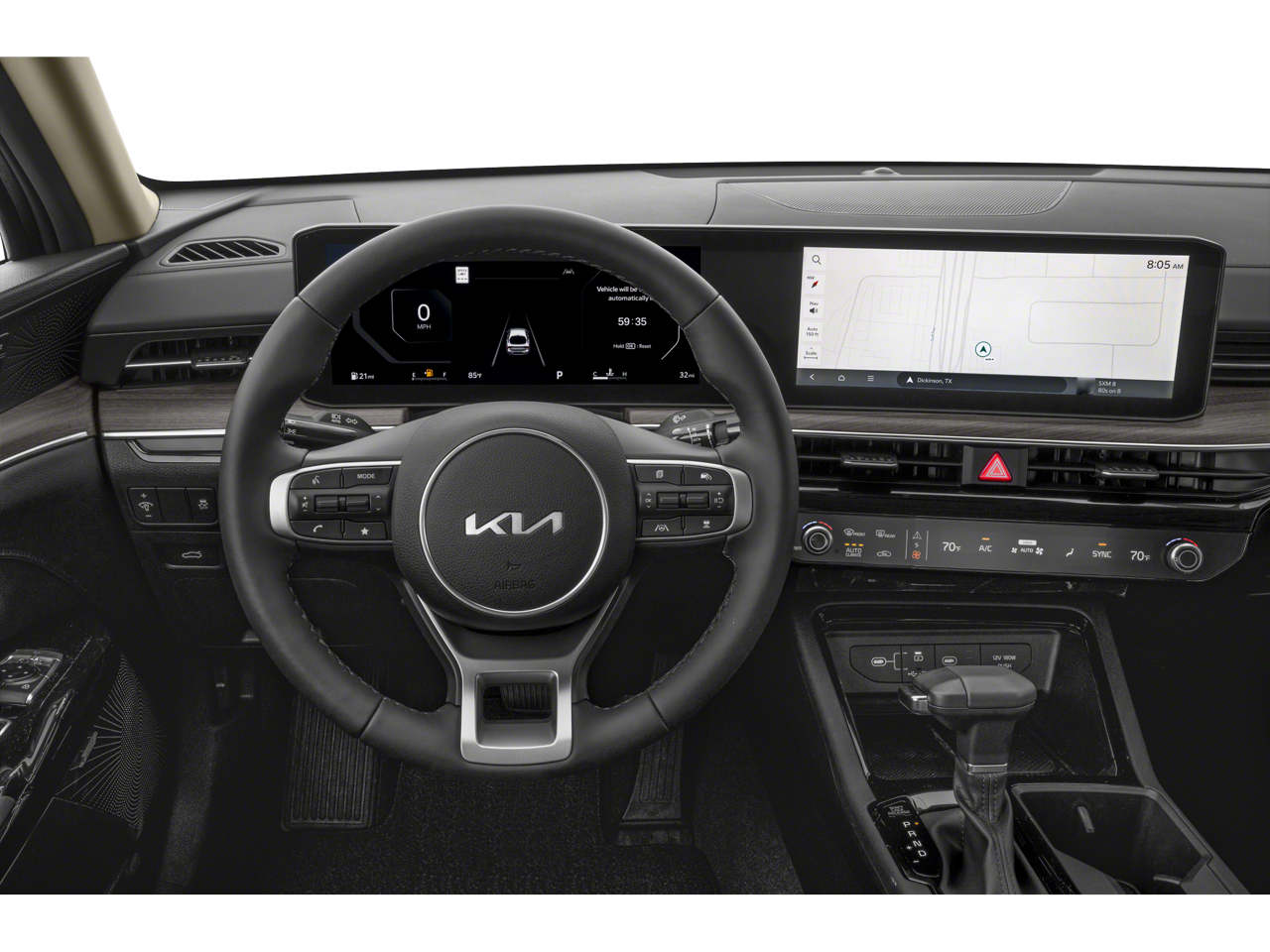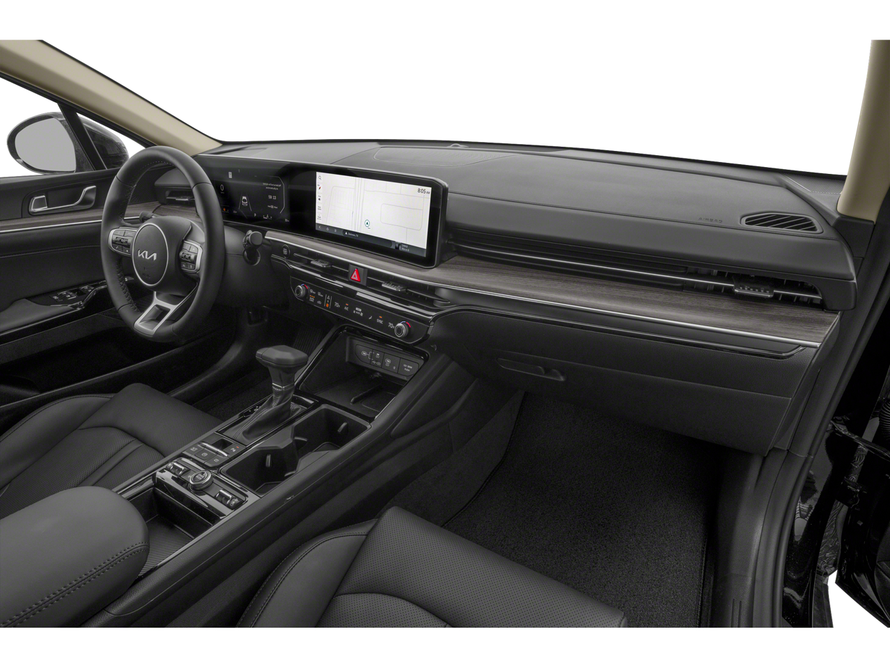 Equipped with 12 Speakers, 4-Wheel Disc Brakes, ABS brakes, Air Conditioning, Alloy wheels, AM/FM radio: SiriusXM, Auto High-beam Headlights, Automatic temperature control, Brake assist, Bumpers: body-color, Carpeted Floor Mats, Delay-off headlights, Driver door bin, Driver vanity mirror, Dual front impact airbags, Dual front side impact airbags, Electronic Stability Control, Emergency communication system: Kia Connect (includes 1 year free trial), Four wheel independent suspension, Front anti-roll bar, Front Bucket Seats, Front Center Armrest, Front dual zone A/C, Front reading lights, Fully automatic headlights, Heated & Ventilated Front Bucket Seats, Heated door mirrors, Heated front seats, Heated steering wheel, Illuminated entry, Knee airbag, Leather Shift Knob, Leather steering wheel, Low tire pressure warning, Memory seat, Navigation System, Occupant sensing airbag, Outside temperature display, Overhead airbag, Overhead console, Panic alarm, Passenger door bin, Passenger vanity mirror, Power door mirrors, Power driver seat, Power moonroof, Power passenger seat, Power steering, Power windows, Radio data system, Radio: AM/FM Audio System, Rear anti-roll bar, Rear reading lights, Rear seat center armrest, Rear side impact airbag, Rear window defroster, Remote keyless entry, Security system, Speed control, Speed-sensing steering, Split folding rear seat, Steering wheel mounted audio controls, SynTex Seat Trim, Tachometer, Telescoping steering wheel, Tilt steering wheel, Traction control, Trip computer, Turn signal indicator mirrors, Variably intermittent wipers, Ventilated front seats, and Wheels: 18 x 7.5J Gloss Black Machined Finish Alloy.
